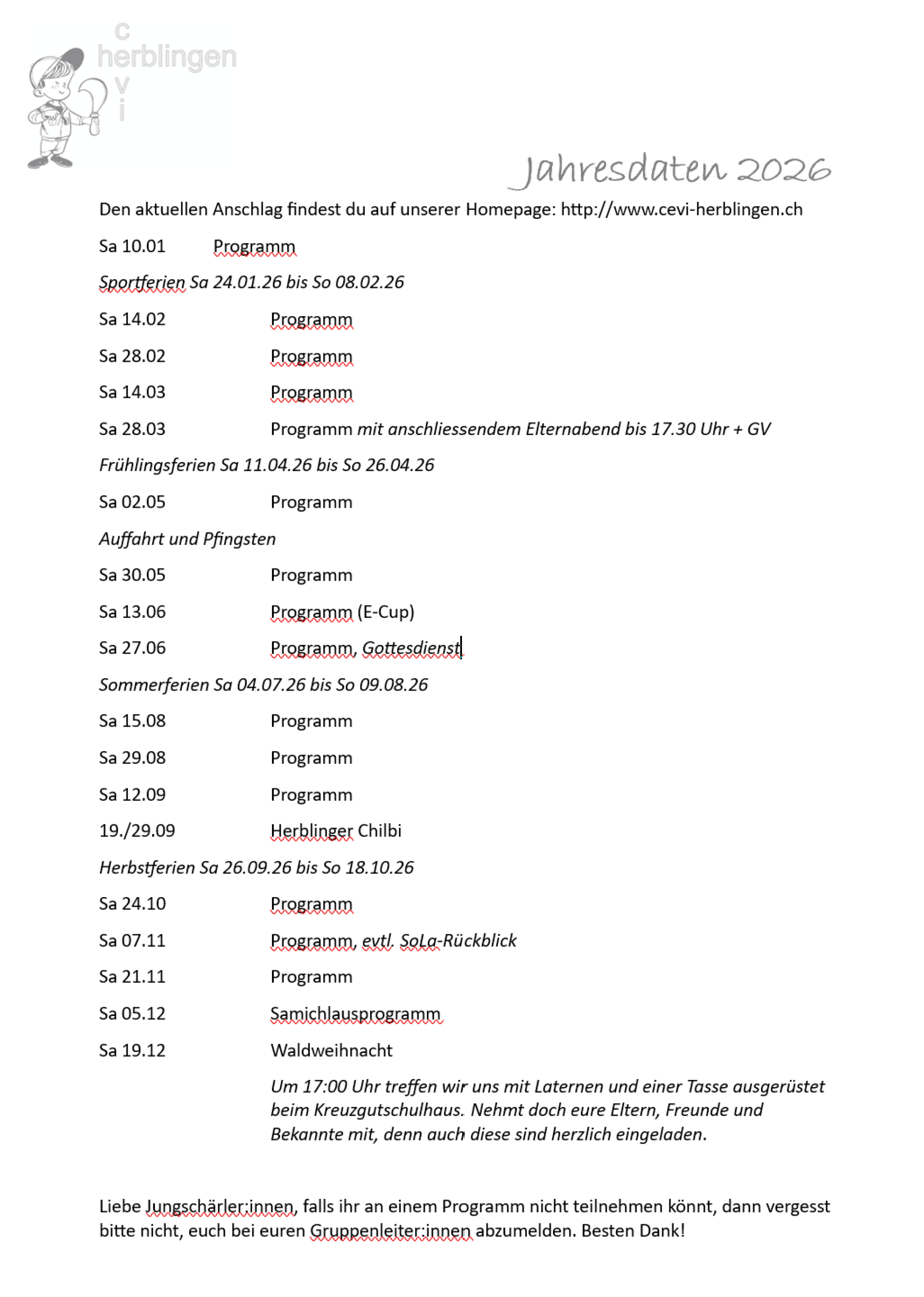 Jahresdaten 2026 Hier finden Sie unsere aktuellen Jahresdaten. Zücken Sie Ihre Agenda und schreiben Sie unsere Daten ein. Jahresdaten 2026